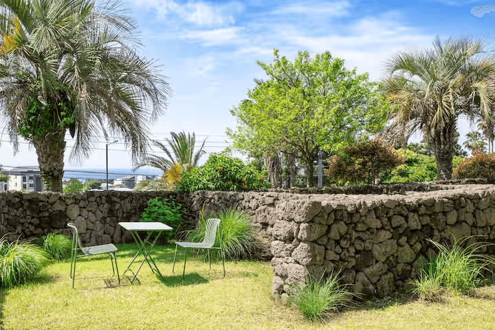 섬스튜디오의 입구로 들어가는 길에 자연스럽게 가꾼 정원에서 프라이빗한 시간을 보낼 수 있도록 나누어둔 돌담 공간 안에 의자와 테이블을 준비해두었어요. 이곳에서 커피 한 잔 하시면서 산책해보세요.